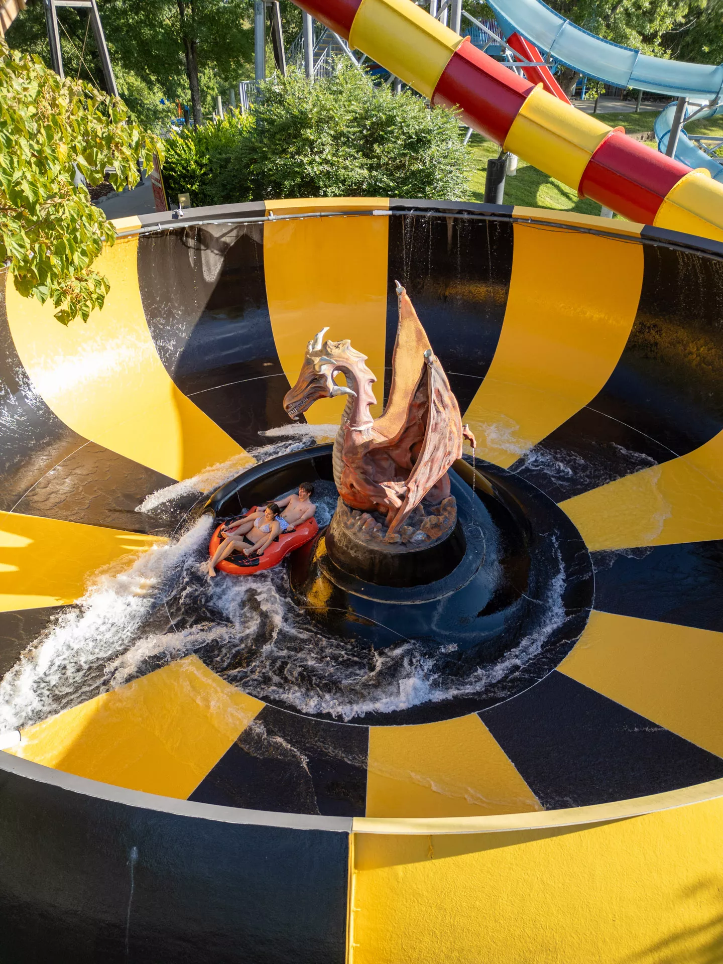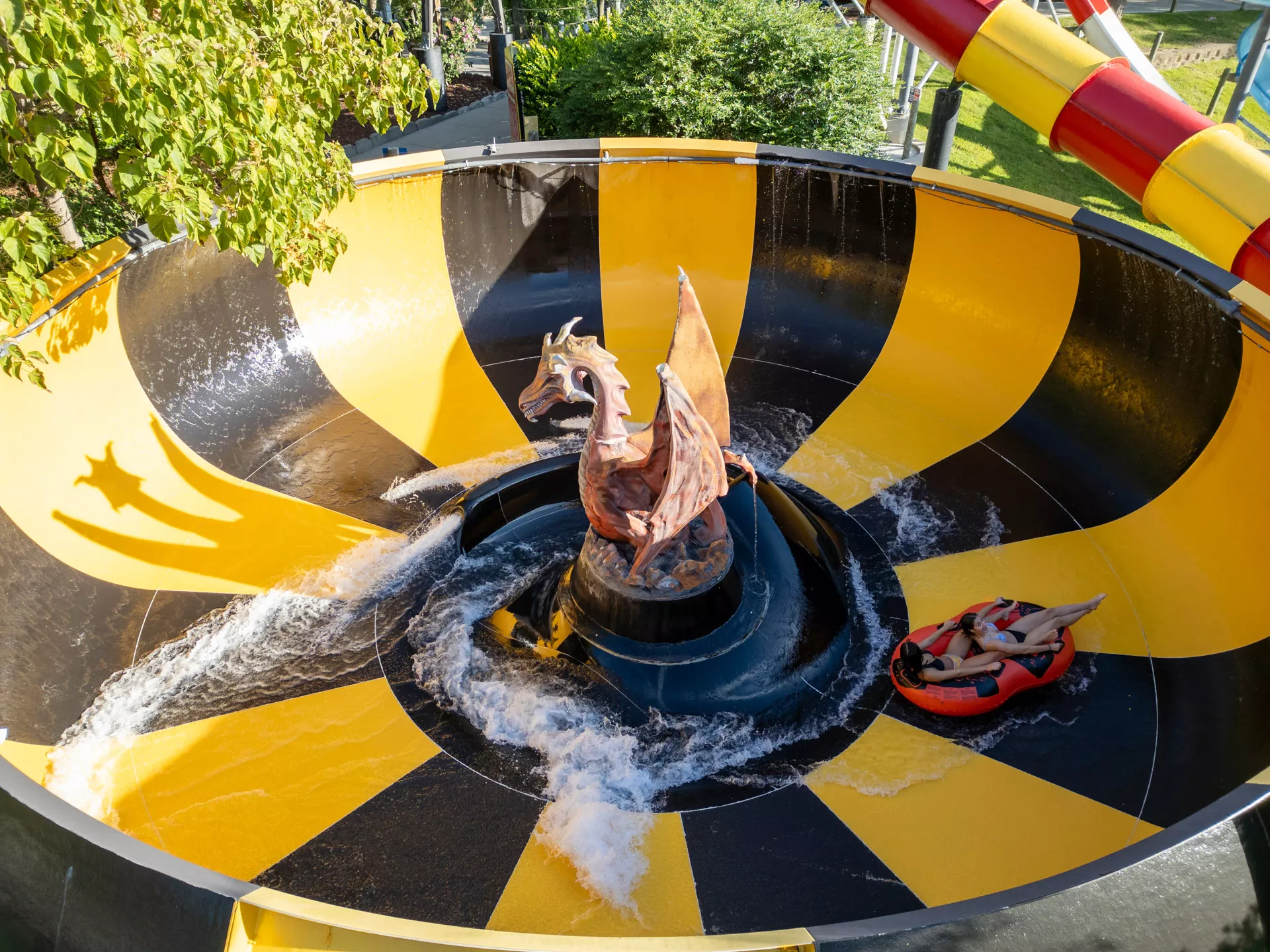 The water slide starts off with a bang as you drop down a 45-foot flume into total darkness. The drop is quickly followed by a hair-raising spin around a slippery 35-foot bowl. Don’t forget to look up to catch sight of a 9-foot dragon as he watches you from above. After a few more twists and spins, you’ll safely slide into the splash pool below.