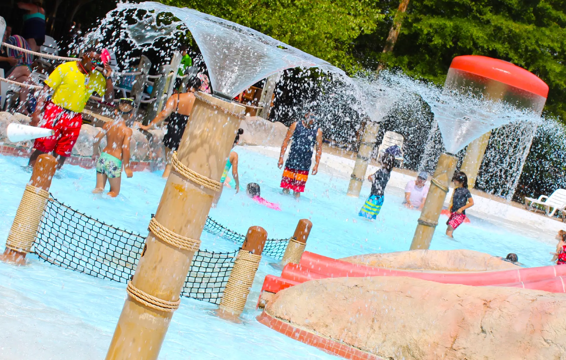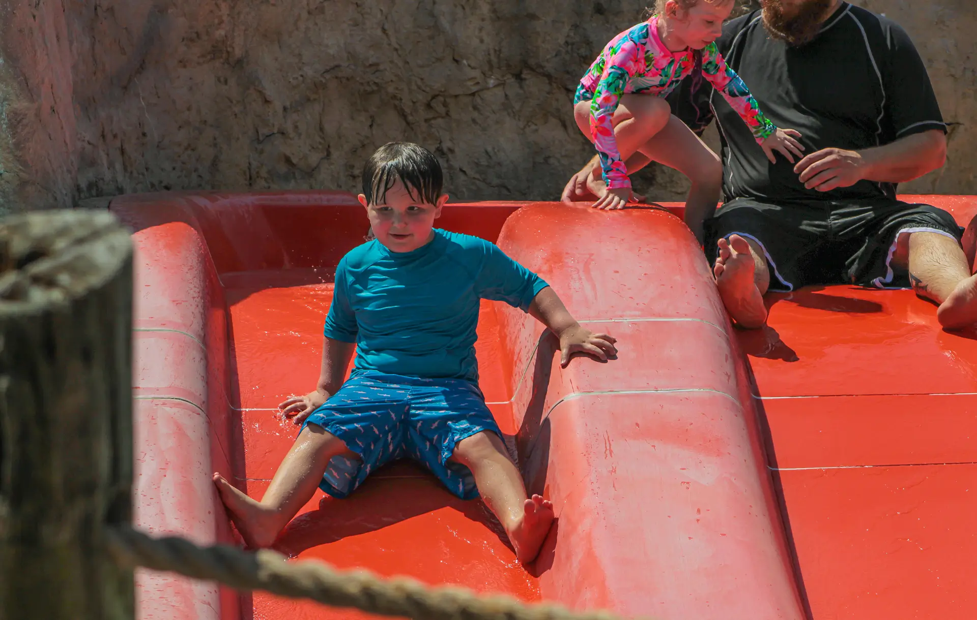 Take a slide down the side of our Splash Island volcano while staying cool by a falling spray of water.