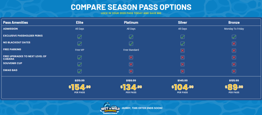- Mix and match passes: Parents often choose Elite, kids pick Silver, and weekday visitors go Bronze